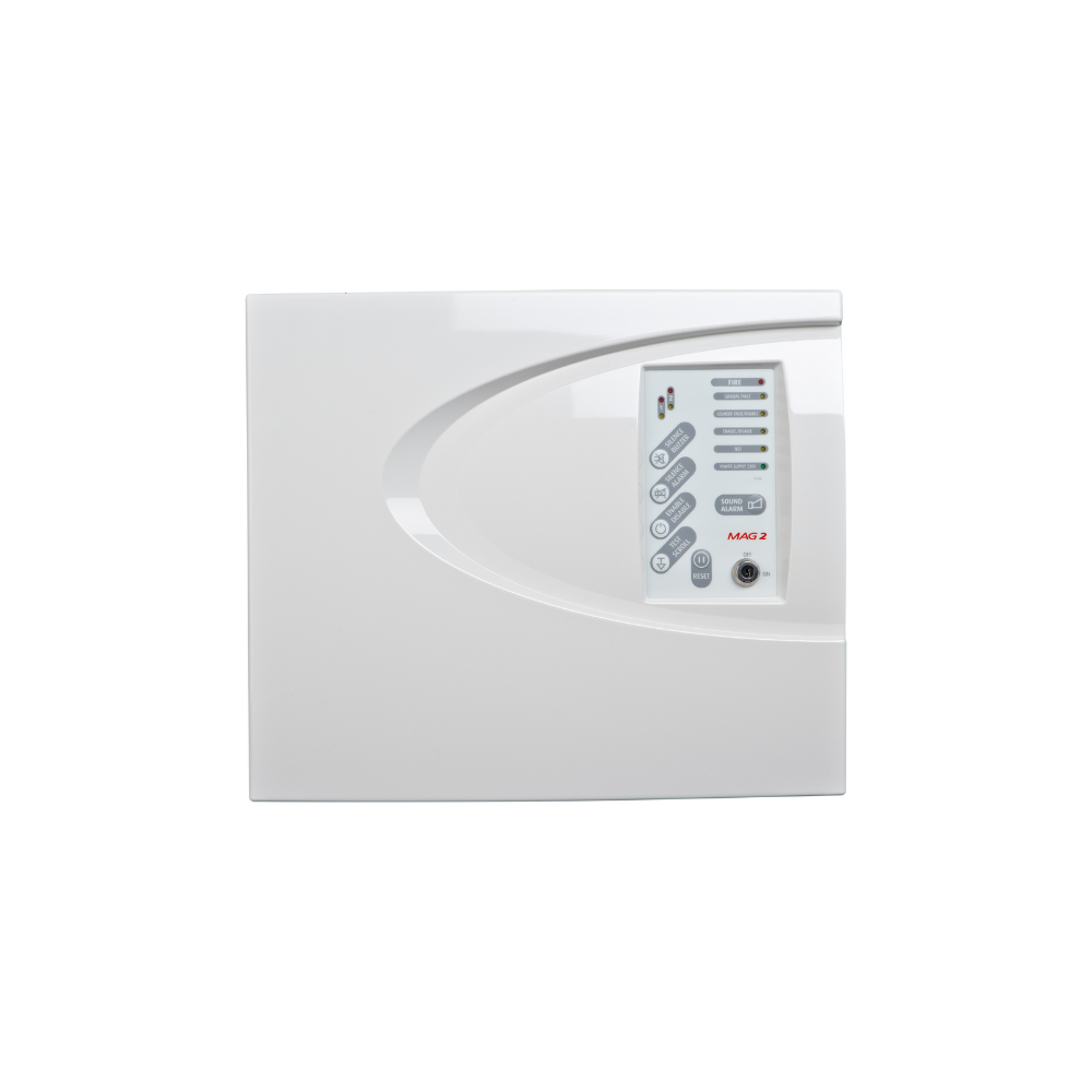 MAG2P is a conventional fire alarm panel certified to EN54-2/4 standard, providing 2 fixed zones. Up to 20 (32 SensoMAG Series) fire detectors can be connected to every fire zone. Unlimited number of call points can be connected to each of the fire zones.